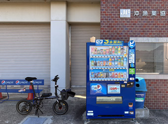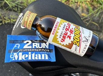 上蒲刈島のアップダウンを繰り返す区間を走行中に、太ももに違和感が出始める。これは脚がつる前兆だ… 普段ならとびしま海道往復程度で(しかもマイペース走行で)脚がつることは無いので、身体の不調が影響して疲れやすくなっているのは間違いない。という事でフロントバッグに常備してある脚つり防止サプリのツゥランと、不眠から来る疲労に備えてコンビニで買っておいたリポビタンDを飲んで持ち堪える。 |