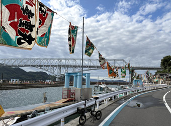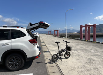 気分もペダルも重い復路走行なのでさっさとマイカーを駐めてあるパーキングに戻りたいところだが、せっかく晴天になったので下蒲刈島でお決まりの撮影スポットに寄り道するも、先客の釣り人がいたので写真撮影を諦める。この日は普段と比べて明らかに釣り人が多かった。その関係でいつも以上に車の往来も多かった。何かの魚がよく釣れる時期なのだろうか。 |