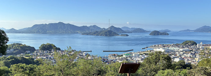黒滝山登山口にある休憩所の”さくら堂”は眺めのいい見晴台になっていて瀬戸内風景を一望。真正面に"うさぎ島"で有名で日本一高い送電鉄塔が建つ大久野島があり、その背後にしまなみ海道六島のひとつの大三島。なかなかいい眺望だ。暑くて疲れたけど寄り道して正解だった。このまま登山口に自転車を置いて久しぶりに黒滝山頂上まで山登りしたい気分になったが、間違いなく暑さにやられるので止めておく。 |