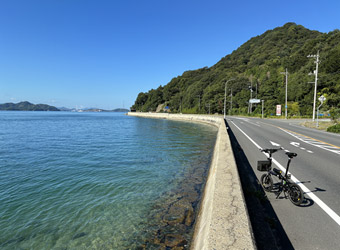 入鹿海岸を後にして外周路に戻り、江田島西岸沿いに延びる道路を南下。何度も走っているコースでも初めて反時計回りの逆走なので新鮮味があるし、快晴で海も青く綺麗なので気分がいい。過去2度の江田島一周サイクリングではこの辺りは夜間走行だったので尚更新鮮味があって楽しい。 |