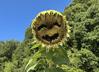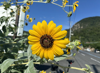 黒滝山登山口から国道に戻り、道の駅たけはらへ向けて復路を進む。途中にあるSAZANAMIモニュメントはやっぱりヒマワリがすっかり無くなっていて、寂しい様相に変わり果てていた。何だかとても残念な気分だ。おそらく花が枯れたので刈り取られたのだと思われ。そんな中3本だけ枯れかけのヒマワリが残されていて、その中の1本がタネが抜かれて絵顔になっていた。少しだけ残念な気分が和らいだ。 |
