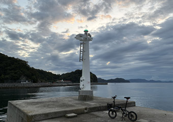 とびしま縦断コース30kmを走っている間も眠気が訪れることは無く、予定通り日の出時刻の6:00に岡村島の岡村港に到着。漁港のY字型防波堤の突端に建つ灯台へ。しかし朝日が昇る東側の空には厚い雲が広がりどんよりしていて、予想した通り日の出は見られず。まぁいい、2週間前のさざなみ海道サイクリングで満足度の高い日の出見物ができたし。それにしてもこのところとびしま海道サイクリングは天気に恵まれていない。 |