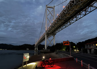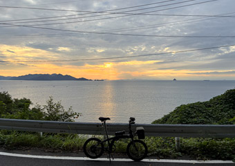 7月頭に行なった因島&生口島サイクリングの時に、因島で日の出見物をするつもりだったのが生憎の曇天で見られず悔しい思いをした件があり、そのリベンジも兼ねて久し振りに因島一周サイクリングをする事に。3:00起床の3:20自宅出発、向島の無料パーキングに4:45到着。時間調整のため車内で少し仮眠(ほぼ眠れず)して5:30サイクリングスタート。9月末でも夜明け前からジメジメと鬱陶しい湿度がありまだ季節は夏。 |