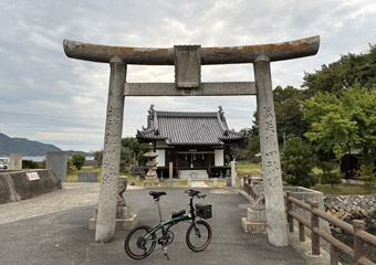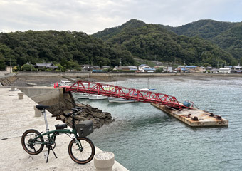 アップダウン道の途中で見えた海原風景の片隅にある小さな漁港の防波堤と神社に目が留まり、何となく気になったので寄り道する事に。住宅が密集する集落の細道に入って海岸へ向けて進んでいくと正面に神社の鳥居が現れ、先ほど見下ろした漁港に到着。しかしこれと言って興味を惹く何かがある場所ではなかった。晴天ならもっと肯定的な印象を受けたかも知れないけど。ただ、防波堤から見る東側の空が雲間から朝焼けと日差しが漏れていて、何となく印象的で暫く眺めていた。こういう風景は曇天だからこそ見られるものだと考えれば、快晴日以外のサイクリングもたまには悪くないように思える。それでもやっぱり空も海も青くて明るい風景の中を走った方が楽しいしリフレッシュにもなる。などとウジウジ考えながら引き続きアップダウンを繰り返す細道を進む。 |
