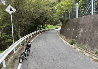 因島東岸沿いの細道区間に入る。カーブが連続する狭小道路でアップダウンを繰り返すので疲れるし、木々に囲まれ海沿いなのに海があまり見られないのでつまらないコース。因島東岸沿いの道路を走るのはかなり久しぶりだがこういう閉塞感のあるコースはやっぱり面白くない。曇天なので余計に面白くない。この区間は端折ってコース変更すればよかったかな…と、ウジウジ考えながらペダルを漕ぐ。 |