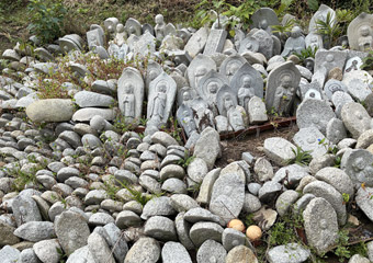 遊歩道脇に置かれた無数の小さい地蔵 |