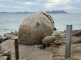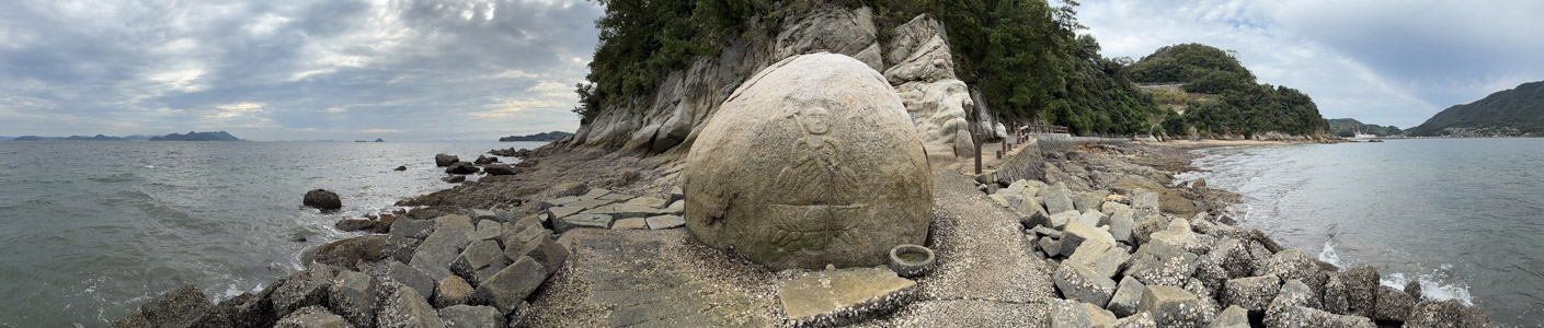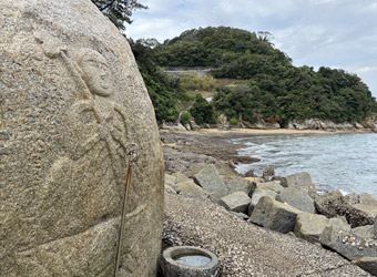 石に彫られた地蔵は想像していたより彫り込みが浅かった。遊歩道入り口にある案内板の説明によると1599年からあるので、元はもっとクッキリした造形だったのが雨風で擦り減ったのかも知れない。今回鼻の地蔵さんを見て佐木島にある磨崖和霊石地蔵を思い出した。同じく干潮時にだけ拝見できる岩に彫られた地蔵で、そちらの方は初訪問で運良く拝見することができたのであった。 |