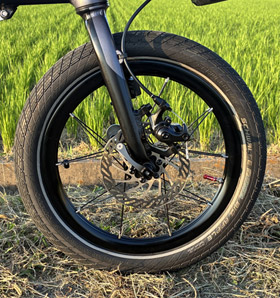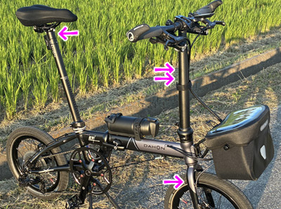 K9Xをよりスタイリッシュかつシンプルな印象のルックスにするためいくつかのパーツを取り外した。ハンドルポストとシートポストに巻いていた銀色の反射バンドを外し、フロントフォークに貼っていた銀色の反射テープを剥がし、全く使っていないハンドルポストに装着したフロントバッグアダプターも取り外し。ハンドルポストとシートポストがスッキリした。 |