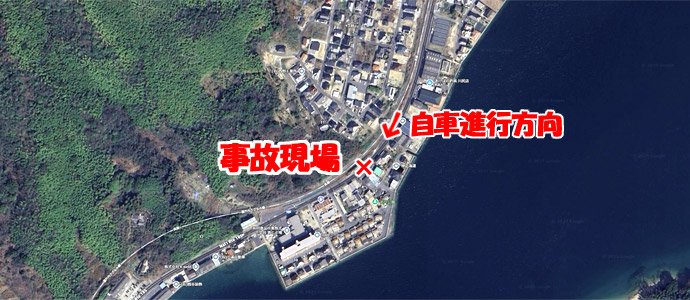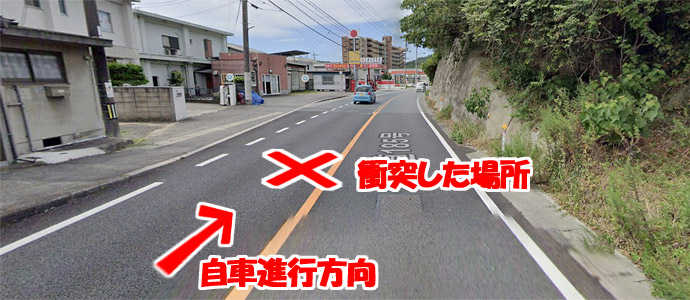 緩い右カーブを走行中の出来事で、ドラレコの映像を見る限り対向車はカーブに差し掛かる時点ですでにこちらの車線を逆走していたと思われる。事故当時は外が真っ暗だった事もあり、カーブの途中で曲がり切れずこちらの車線にはみ出してきたように見えた。対向車は直ぐに反対車線に軌道修正すると思いきや、完全にこちらの車線を逆走する形で迫って来たので咄嗟の判断で反対車線にハンドルを切る。しかし思ったよりハンドルの遊びが大きく素早く対向車線に移動しきれず逆走車と接触し、大きな衝撃と共に自車はスピンして停止。車道のセンターラインの上で停止して二次被害の危険を感じたため、少しでも道路脇に寄せようとアクセルを踏むがほとんど動かず。車から降りると路上に大小の自動車部品が散乱していて、自車の左側面が全体的に大きく損傷していた。左フロントタイヤはサスペンション部分まで損傷していて自走不能な状態。大きな交通事故になってしまった。それでも、正面衝突を回避できただけでも本当に良かったと思う。 対向車は軽自動車。後の現場検証で担当警察官からの話と事故当時の写真で知った事だが、対向車は自車との接触で歩道側に弾かれて道路脇に立つ反射板付きのポールを倒し、車道の端で横転していた。対向車に乗っていたのは運転手のみで未成年の女性だった。逆走の直接の原因は居眠り。 |