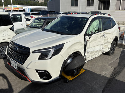 ディーラー担当者の話では、修理は不可能ではないが足回りまでダメージがあるので走行時の微振動やハンドリングの微妙な違和感が出るかもしれないとの事。廃車となり買い替えが必要になる可能性も考慮しなければいけなくなった。 |