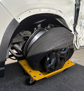 正面衝突は回避できたのでフロント周りは無傷でエンジンも無事だったが、左側面は全体的に大きく損傷。左フロントタイヤはサスペンション周りまでダメージを負っていて、仮に修理できたとしても剛性まで元通りにはならないだろうと思うレベル。 |