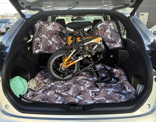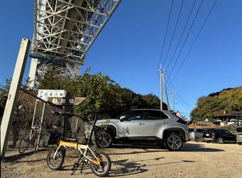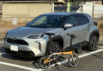 交通事故に遭って不本意ながらも買い替えたマイカーのヤリスクロスに自転車を載せてサイクリングに出掛けるのもこれが初めて。廃車になったフォレスターよりボディサイズはひと回り小さくなったが、ラゲージスペースは十分な奥行きと高さがあるのでこれまで通り折り畳み自転車を畳んで立たせた状態で問題なく車載できる。 |