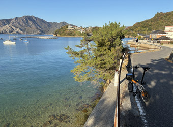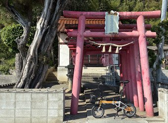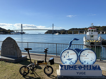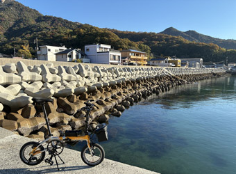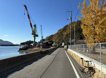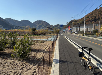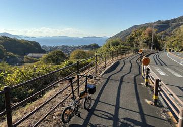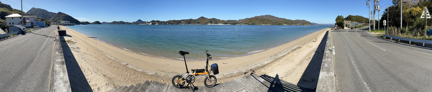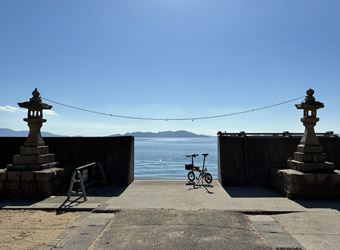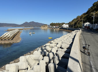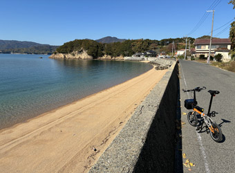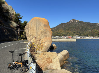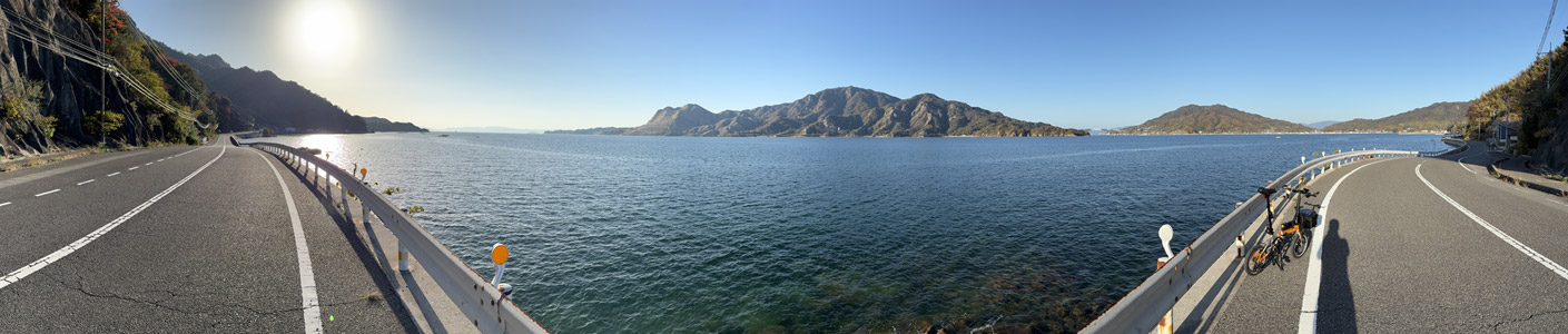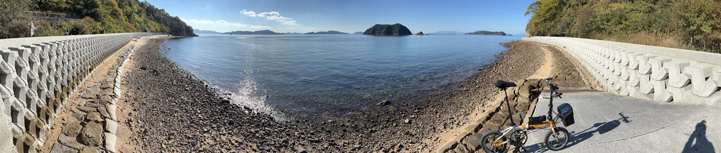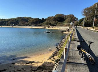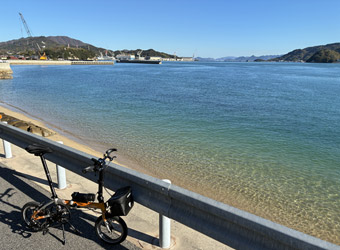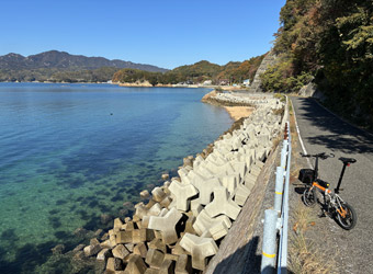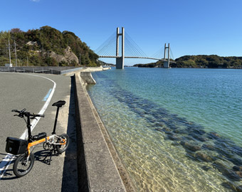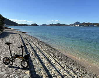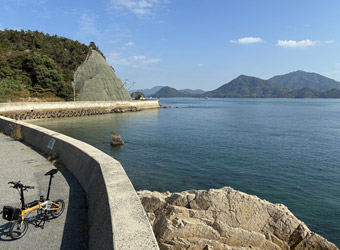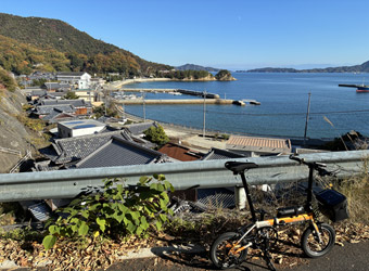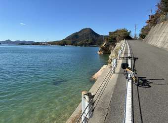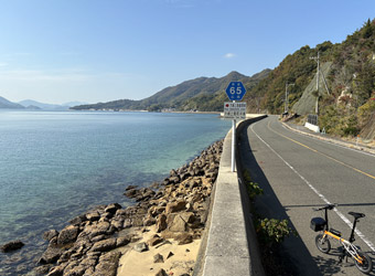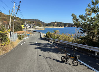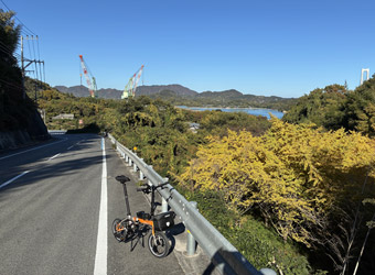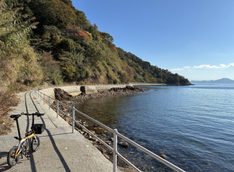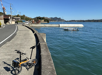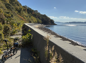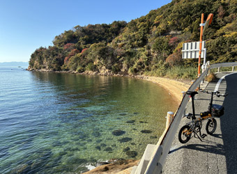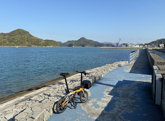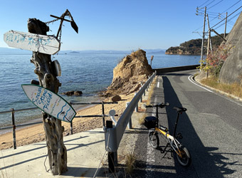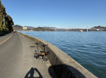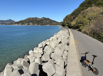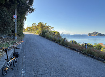 自転車神社から因島南西岸に出て外周路を北上。今回の因島サイクリングは島一周ではなく島半周とボリューム少なめだが、14インチタイヤのK3にはそれくらいのゆるポタが丁度いい。前週の倉橋島鹿島サイクリングはアップダウンが非常に多い上走行距離が60km弱になり、ポタリングの域を超えたがっつりライドになってしまいくたびれた。 |