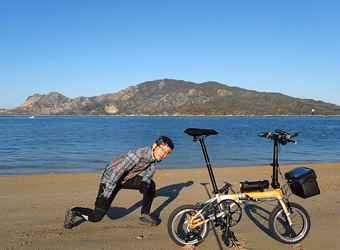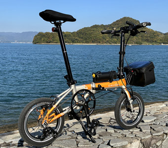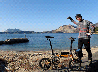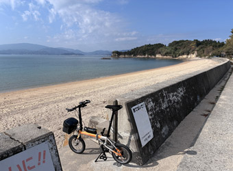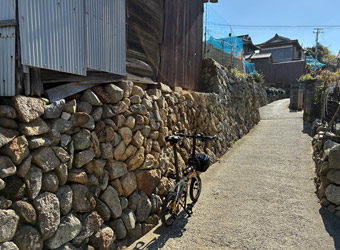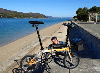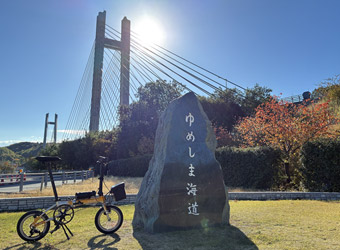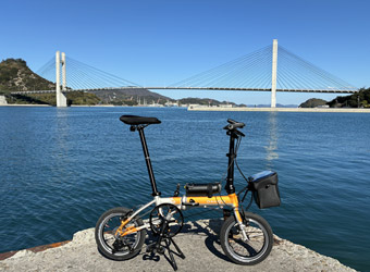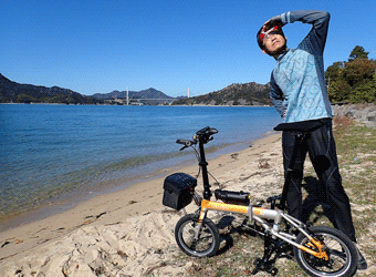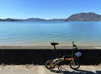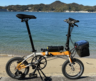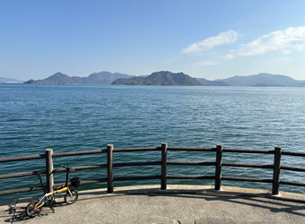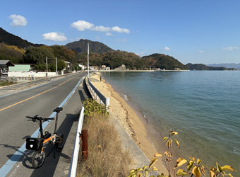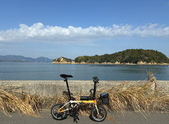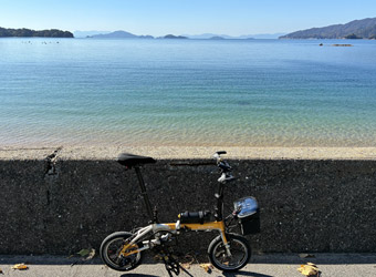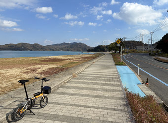 弓削島に入ったら島の西岸沿いを北上。長閑な風景を眺めながらのんびりペダルを漕いで行く。ゆっくりポタリングを楽しむのに自転車の性能はそれほど必要ない、14インチタイヤと3段変速のK3でも十分走れる。但し平地メインのコースのみ。 |