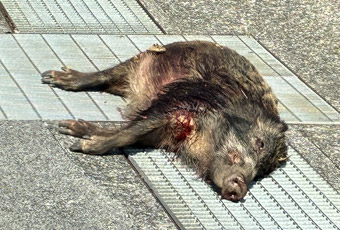 走行中にふと地面に転がる物体が目に入る。動物?…寝ている?…イノシシっ!?が死んでる!!…民家の前で大人のイノシシが前足付け根辺りから血を流して死んでいた。猟銃で撃たれて駆除されたのだろうか、しかし周りに人の姿は無い。まさかクマに襲われたなんて事はないハズ、瀬戸内の島に熊がいるなんて聞いたこと無いし。ともあれ江田島でも二度イノシシに遭遇しているし、サイクリング中でもイノシシ注意だ。 |