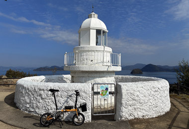 大崎上島で特にお気に入りのスポットが中ノ鼻灯台。で、灯台が建つ高台まで続く急勾配の上り坂がK3ではまぁまぁキツかった。N8やK9Xならギアを1番軽くすれば座ったままペダルを漕いで上り切れるが、K3は立ち漕ぎしないと厳しかった。そしてこの時点でハッキリした、頑張ればK3でとびしま海道往復60km走れるかも知れないと思ったりもしたが考えが甘かったと。長い上り坂が多いあのコースで貧脚の自分がK3で往復するのは無理だと確信した。ちなみに中ノ鼻灯台は敷地内のベンチで1組の家族が宴会みたいな事をしていたのでゆっくりできなかった。 |
