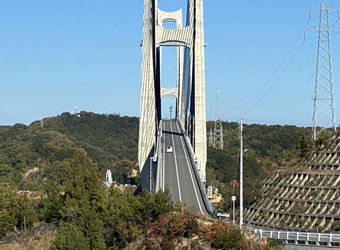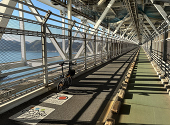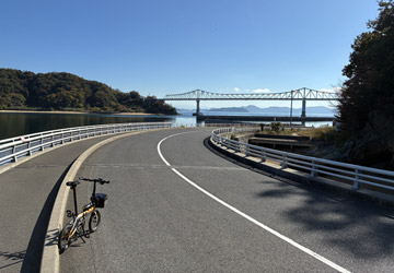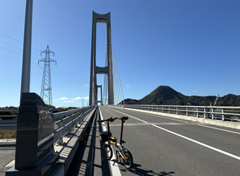 はっさく屋で買い物を済ませたところで因島半周サイクリング完了。向島に戻るため因島大橋まで上り坂が続く自転車歩行者道に入る。しまなみ海道でロングライドをすると復路は各橋へ上がる自転車歩行者道がしんどいものだが、のんびりショートライドのポタリングならK3でも余裕だった。 |