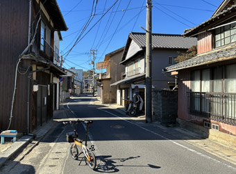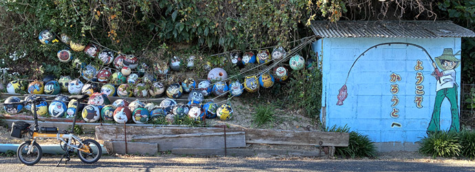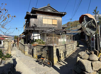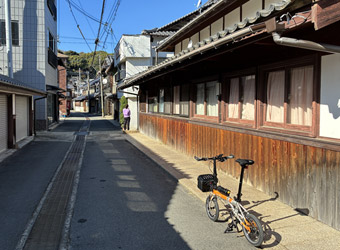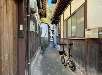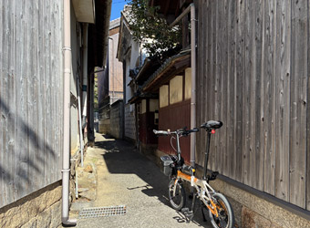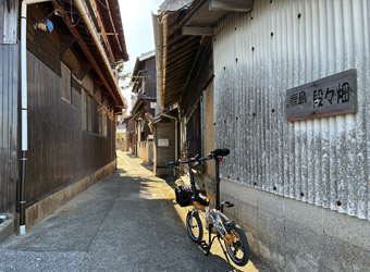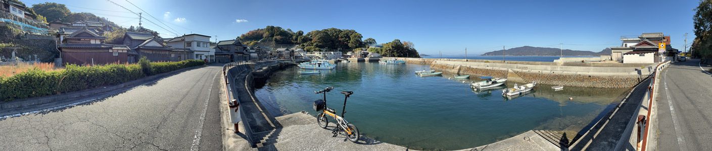 寄り道三箇所目は古い町並みが残る港町の室尾。迷路のように張り巡らされた狭小路地を探検気分で散策するのが楽しい。ここは半年前の曇天サイクリングの時に初めて訪れたが、日差しを遮るほどの狭小路地でもやっぱり快晴日に散策した方がずっと楽しい。何処で何をするにしても外での行楽は曇天より快晴の方が楽しい。 |