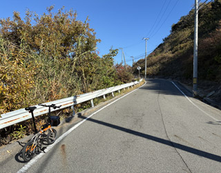 大西港から外周路を時計回りに走って4分の3くらい進んだ所で初めて長い上り坂に差し掛かる(中ノ鼻灯台までの上り坂は横道なので含まず)。勾配もまぁまぁあってここでも立ち漕ぎで上り切る。やっぱりK3は上り坂が苦手だ。でも結局は乗り手の脚力次第で、K3で上級者向けのヒルクライムコースを走る人もいる。自分が貧脚サイクリストである事を改めて自覚。 |