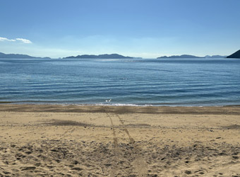 大西港スタートの時計回り大崎上島一周で最後の立ち寄りスポットになるのが大串海水浴場。夏場は海水浴などを楽しむ行楽客の姿がある(多分皆島民)が、肌寒くなってきた11月半ばともなると人の姿はほぼ無し。この砂浜海岸からの海原風景を眺めていると、何故かいつも少しおセンチでブルーな気分になる。後は港へ戻って帰るだけという理由だけではない気がする。 |