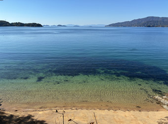 弓削島北西岸にある高浜八幡神社前の海岸線がゆめしま海道一番のお気に入りスポット。海がとても綺麗で浅瀬が透き通った砂浜海岸が続く。何だかとても心が癒され落ち着く眺めだ。 |