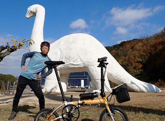 なるべく海岸沿いを走りながら因島北端まで戻り、因島アメニティ公園にあるザウルくんの前で写真撮影。ロードバイクに乗っていた頃はいつも素通りしていたザウルくんだが、いつの間にか因島のお決まり撮影スポットになっていた。散歩感覚で走れて何処でもサッと停められるスタンドが付いた小径車なら、ちょっとしたスポットやふと目に留まった場所に積極的に寄り道する気になれる。 |