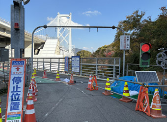 立石港から生名島東岸沿いを南下して行き、南隣の佐島とを繋ぐ生名橋を渡る。元々生名橋には自転車歩行者道があって車道は中央線無しの1車線だったが、今回の訪問時は自転車歩行者道が無くなり片側1車線の道路になっていた。2022年に岩城橋が開通して生名島と岩城島が繋がった影響で車の交通量が増えたのかも知れない。 |