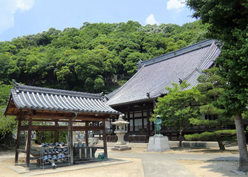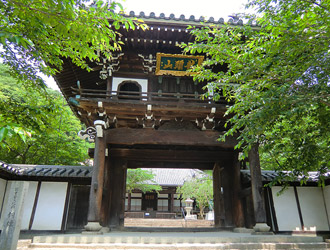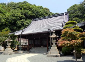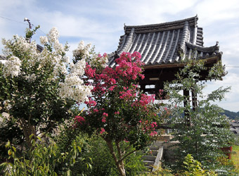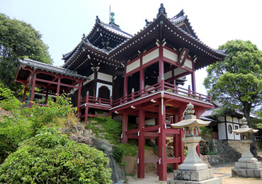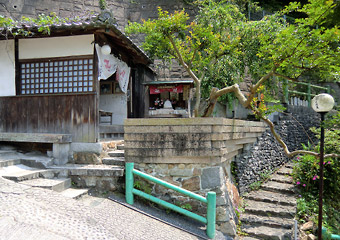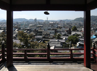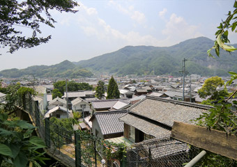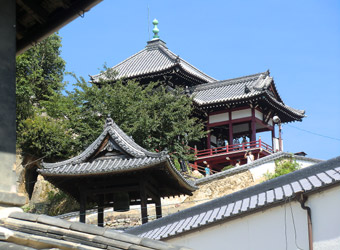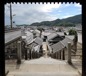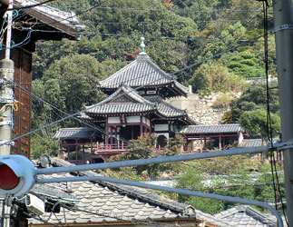 お好み焼きほり川の前のT字路を曲がると西方寺山門へ続く石段が延びていて、西方寺本堂からさらに石段を上ると町並み保存地区のランドマークである普明閣がある。 |