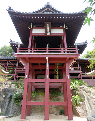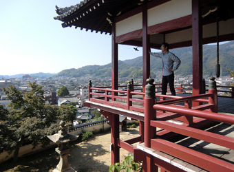 西方寺普明閣は、1958年に京都の清水寺の舞台を模して建てられたと言われている観音堂。清水寺と比べるとかなり小振りだが、ランドマークとしての存在感は十分。靴を脱いで舞台に上がることができる。舞台からは竹原の町並みや朝日山を眺望できる。 |
