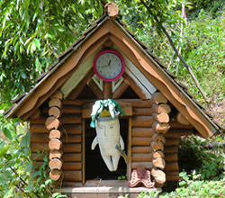 歴史民族資料館の一軒隣にある細い横道を入った先にもお抱え地蔵がある。細道を奥へ進み少々急な坂を上っていくと、途中に犬小屋らしきものがあるのだが、何故か大根(多分)の人形が。頭に兜、手に刀を持っている。そして顔がシュール…これは一体何? |