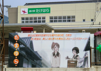 竹原市はたまゆらで町興しするのにかなり力を入れているらしく、まちなみ保存地区の側にある道の駅にはたまゆらのグッズを販売するコーナーがあり、竹原市役所にはたまゆらの大きな看板が掲げられている。本来「竹のまち たけはら」なのだが、「たまゆらのまち たけはら」になっている。 |