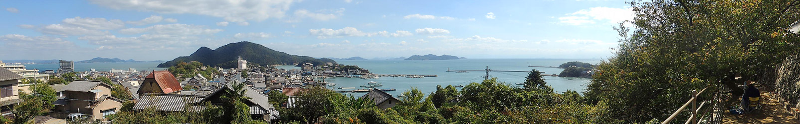 鞆の浦のほぼ真西に位置する場所に後山公園がある。公園には二箇所の展望台があり、第一展望台からは360度のパノラマを眺望できる。第二展望台は第一展望台よりも低いところにある上、周囲の木々が妨げになって正面の景色しか見られず。 |