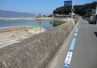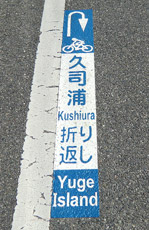 高浜八幡神社から少し北の久司浦というところまで進むと、県道のアスファルトにサイクリングコース折り返しの表示。これより先の県道は西海岸沿いから東海岸沿いへと周り、アップダウンを繰り返す断崖の上を通る道が続くからだろうか。平坦な道をサイクリングするならここまで。島を一周したい人はそのまま先へ。 |