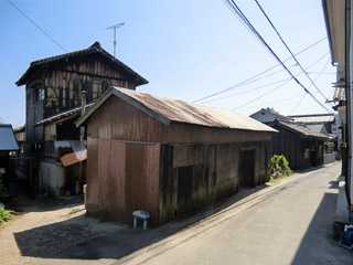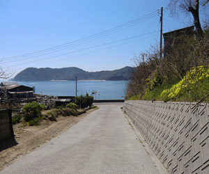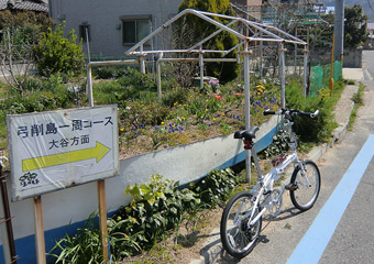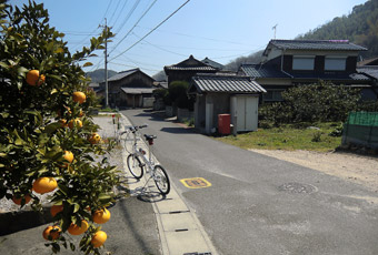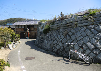 6kmほどアップダウンを繰り返す海岸沿いを走り、島の中心よりやや南に位置し最も住宅が密集した町の細路地に入る。この辺りも古い木造家屋を多く目にする。弓削島は郷愁町並み風景が多く残されている島。 |