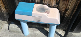 弓削島の住宅地でたくさん見かけるのが、二本の柱で立つ青と白の物体。初めて目にした時は牛乳受け箱かと思ったが、上部の透明カバーの中を覗くと水道メーターらしきものが。何のためにこのようなカバーで覆っているのだろう。 |