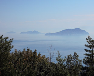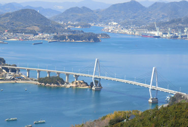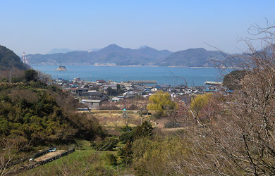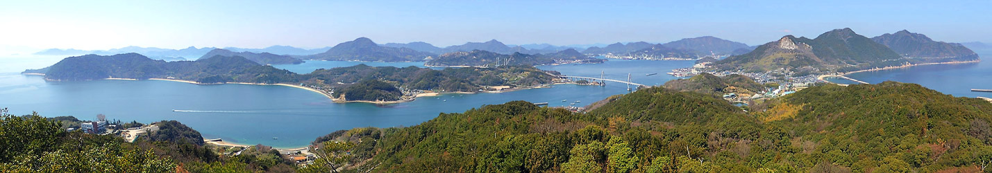 標高142mの久司山展望台からは、弓削島北部や佐島・生名島、さらにその西にある岩城島などが並ぶ多島風景を一望。東南側には遠くにある小島が三つ並んで見える風景。マイナースポット?ながらも眺望は最高。 |