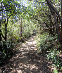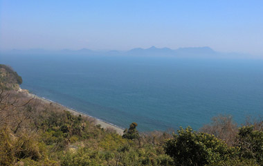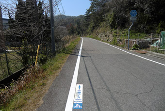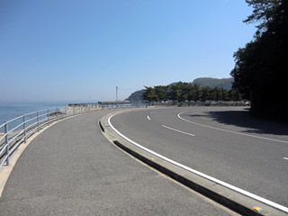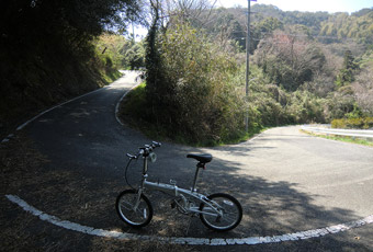 法王ヶ原からさらに県道を南へ進む。松原海水浴場を離れて直ぐに内陸を通る山道に入り、暫く上り坂が続く。つづら折りの急坂もあり、自分の脚力と自転車の性能的に結構キツイ。サイクリング開始からずっとペダルを漕いで進んできたが、とうとう自転車を降りて歩く。にわかサイクリストが無理するのはよくない。 |