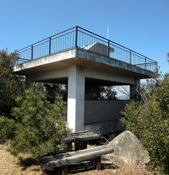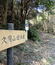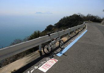 弓削島南部東岸寄りの県道で一番高いところまで上ると、久司山(くじやま)の山頂展望台へと続く遊歩道入口がある。自転車を路肩に停め、未舗装の遊歩道を5分ほど歩いて展望台に到着。 |