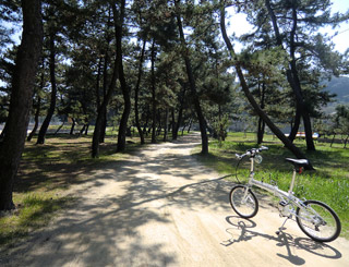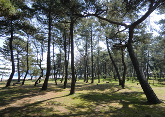 住宅密集地の南にある弓削島を代表する観光スポットの名勝地、法王ヶ原(ほうおうがはら)に立ち寄り。樹齢300年の松の木が続く松原。 |