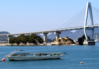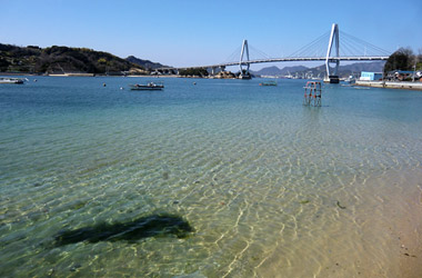 久司山を下りて弓削島南部西岸に出る。陽光を浴びた海岸の浅瀬は南国の海を想わせる透明感と鮮やかさ。ゆめしま海道の海は本島に綺麗。海岸沿いに北へ進み、佐島へ渡るため弓削大橋に戻る。 |