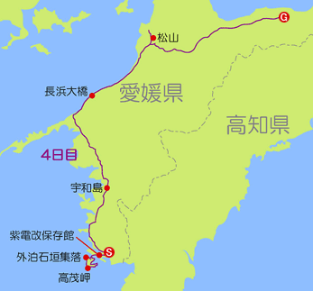 入浴後は香川県に向けて車を走らせる。最初は海沿いに走ろうと松山市内から国道を北上し始めるが、結構遠回りになり時間とガソリンの無駄にもなるので市内に引き返し、最短で香川県にまで行ける国道に入り東へ進む。しかし22:00をまわった頃に眠気を感じ、コンビニに車を停めてそのまま眠ってしまう。 |