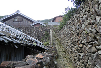 外泊(そとどまり)石垣集落は小さな漁村で、山の斜面に積まれた石垣の上に家が建てられている。石垣は潮風や強風から家を守るためのもの。集落の中へ入ると高い石垣の塀に囲まれた細い道が迷路のように張っていて、何とも独特の雰囲気がある。斜面の道を上へ上へと進むと荒れ果てた畑のような場所に出る。外泊石垣集落も過疎化が進んでいるようで、田畑が放置され家も減っているらしい。 |