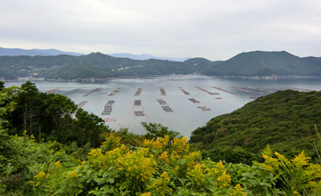 高茂岬から半島一周を続行。一周するのに大した距離は無いが、いかんせん道が細くカーブばかりでスピードをあまり出せないので、思うように進まない。もう本当に細道の運転は飽き飽き。途中海に広がるはまちの養殖場が目に留まる。この景色も晴天ならばいい眺めなんだろうなぁ、と晴れない気分で眺める。やはり雨天も曇天も旅の天敵。しかし雨ならともかく、曇り空でも足止めしていたら旅が全然進まない。なので先へ進むしかないのである。 |