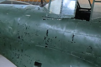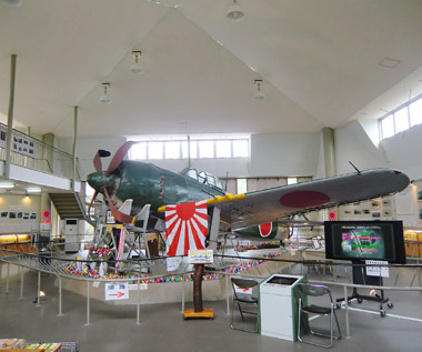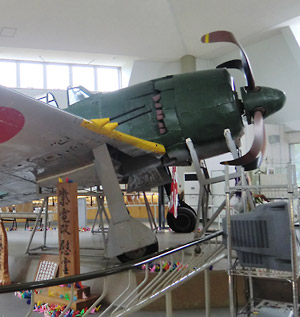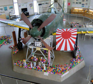 小ぶりな建物の中心に紫電改は展示されている。展示台には当時紫電改で出撃したパイロットの写真と、その前にお酒の供え物。そして沢山の折鶴。機体は全体的に海水の腐食による穴が空いていて、翼のフラップは外板が完全に剥がれて骨組みがむき出しになっている。保存のための補修や再塗装はされているものの、機体の状態はほとんど海から引き上げられた時のままだとか。 |