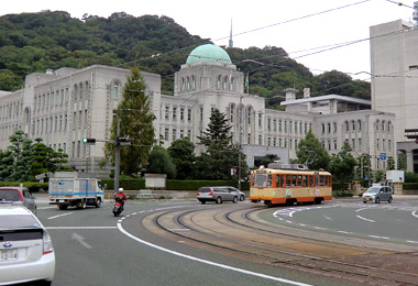次は松山城が建つ山のふもとにある愛媛県庁へ。これは映画「世界の中心で、愛をさけぶ」で、長澤まさみ演じるアキが入院していた病院のロケ地。県庁前停留場はサクがアキを病院から連れ出す時に路面電車に乗った場所。何だか妙な満足感。”セカチュー”は特に好きな邦画で、以前から機会があればロケ地巡りをしたいと思っていた。翌日は映画ロケの本拠地である庵治町を観光するので、それを考えると気分が上がる。 |
