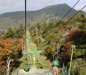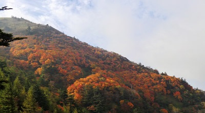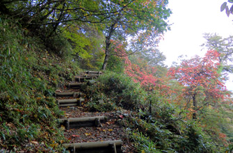駅前のベンチで小休憩し、栄養補給して登山再開。上に登るにつれ気温は下がって行き、登山で熱くなった体には気持ちがいい。雲は次第に晴れて青空が目立つように。そして部分的に紅葉した山肌。まさか紅葉が見られるとは思いもしなかった。この調子なら頂上からいい景色が見られそうだと気分が上がる。 |