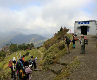 7:40に剣山駐車場に到着。空には晴れ間が出てきたものの依然雲は多い。気が向いたら剣山に登ろうと思っていたが、この天気では山頂からいい景色を眺められるか分からないし、登山中に雨に降られたりしたらたまったもんじゃない。しかし折角酷道を長々と走って来たわけだし…迷いに迷った結果登山決行。トレッキングシューズに履き替え、リュックにレインウェアや栄養補助食などを入れて準備。 |