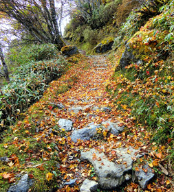 西島駅から頂上までは約40分。不摂生な旅にはこたえる…頂上まであと少しという所で、山道が紅葉の落ち葉で敷き詰められた場所が。これは綺麗な紅葉のじゅうたんだ。落ち葉で足を滑らさないように気をつけて歩く。そして9:30、頂上にある神社にたどり着く。神社の隣には山荘も建っていて、何となく富士山頂を思い出させる。人の姿は無い。もしかしてこの日の一番乗り? |