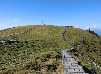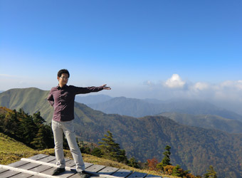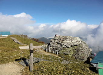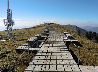 神社と山荘の間にある階段を登ると頂上の開けたところに出る。頂上を一周するように木の階段道が続いていて、道の途中途中には見晴台がある。剣山周辺の雲はすっかり晴れ、青空と涼しい風が最高に気持ちいい。剣山駐車場に着いた時は天気が微妙で登山するかしないかで迷ったが、頂上まで登って大正解だった。 |