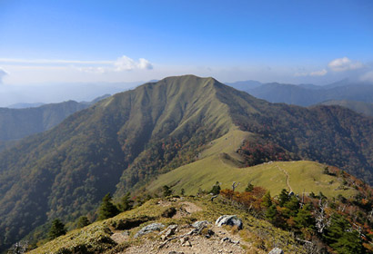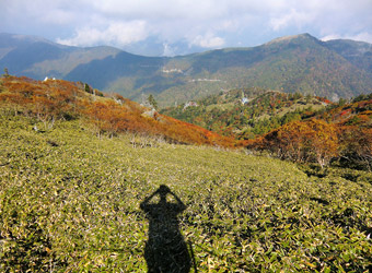 頂上の平たい所まで上がり、広い木道を進んだ先に標高1955mの剣山頂上最高地点。ここまで駐車場から登り始めて約1時間30分。視界に人影は無く、やはりこの日の登頂一番乗りのよう。リフトを待たず駐車場から登山道を歩いた甲斐があった。剣山頂上最高地点からは、ジロウギュウという山が目の前に広がり、これが何とも雄大で素晴らしい眺め。剣山頂上からジロウギュウ頂上まで尾根伝いに一本道が延びている。ジロウギュウ頂上まで歩いてみたい気もするが、そうなるとここで1日消費する事になるし、1日がかりの登山をするには体力もリュックの中の装備も不十分なので止めておく。 |